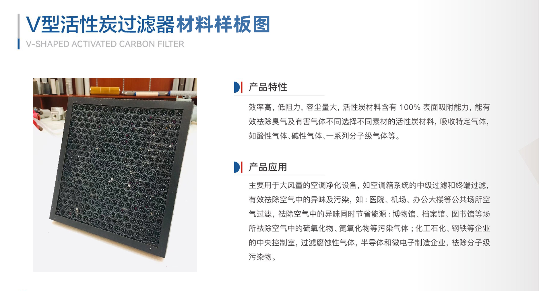效率高,低阻力,容塵量大,活性炭材料含有  表面吸附能力,能祛除臭氣及有害氣體不同選擇不同素材的活性炭材料,吸收特定氣體,如酸性氣體、堿性氣體、一系列分子級氣體等。